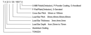 TA323/30/100FU—Series 30 Aluminum Rectangular Bar Grating, Flat/Plain Load Bars 32×3 at 30mm Centres, Cross bars at 100mm Spacing, Mill Finish.